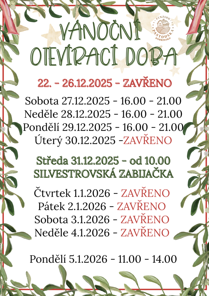 MOŽNOST KOMENTOVANÉ PROHLÍDKY NAŠÍ FARMY PROSINEC 2025 ČTVRTEK 4.12.2025 - ZAVŘENO catering v Moravském Krumlově na zámku PÁTEK 5.12.2025 - 11.00 - 14.00; 17.00 - 21.00 SOBOTA 6.12.2025 - ZAVŘENO najdete nás na trzích v Třebíči NEDĚLE 7.12.2025 - od 12.00 ADVENTNÍ minijarmark; 17.00 - 20.00 PÁTEK 12.12.2025 - 11.00 - 14.00; 17.00 - 21.00 SOBOTA 13.12.2025 - UZAVŘENÁ SPOLEČNOST NEDĚLE 14.12.2025 - 12.00 - 14.00; 17.00 - 20.00 PÁTEK 19.12.2025 - 11.00 - 14.00; 17.00 - 21.00 SOBOTA 20.12.2025 - 12.00 - 14.00; 17.00 - 21.00 NEDĚLE 21.12.2025 - 12.00 - 14.00; od 17.00 VÁNOČNÍ VEČÍREK pro všechny VÁNOČNÍ OTEVÍRACÍ DOBA 22. - 26.12.2025 - ZAVŘENO SOBOTA 27.12.2025 - 16.00 - 21.00 NEDĚLE 28.12.2025 - 16.00 - 21.00 PONDĚLÍ 29.12.2025 - 16.00 - 21.00 ÚTERÝ 30.12.2025 - ZAVŘENO STŘEDA 31.12.2025 - SILVESTROVSKÁ ZABIJAČKA od 10.00 LEDEN 2026 ČTVRTEK 1.1.2026 - ZAVŘENO PÁTEK 2.1.2026 - ZAVŘENO SOBOTA 3.1.2026 - ZAVŘENO NEDĚLE 4.1.2026 - ZAVŘENO PONDĚLÍ 5.1.2026 - 11.00 - 14.00